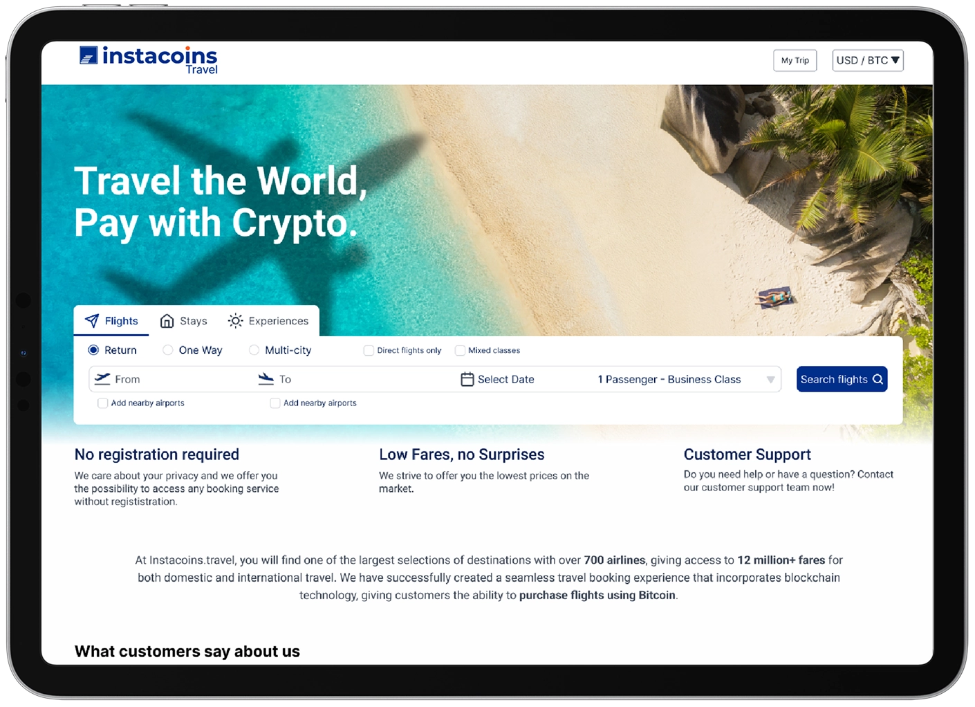 Browse flights, stays or experiences through the Instacoins travel platform.
